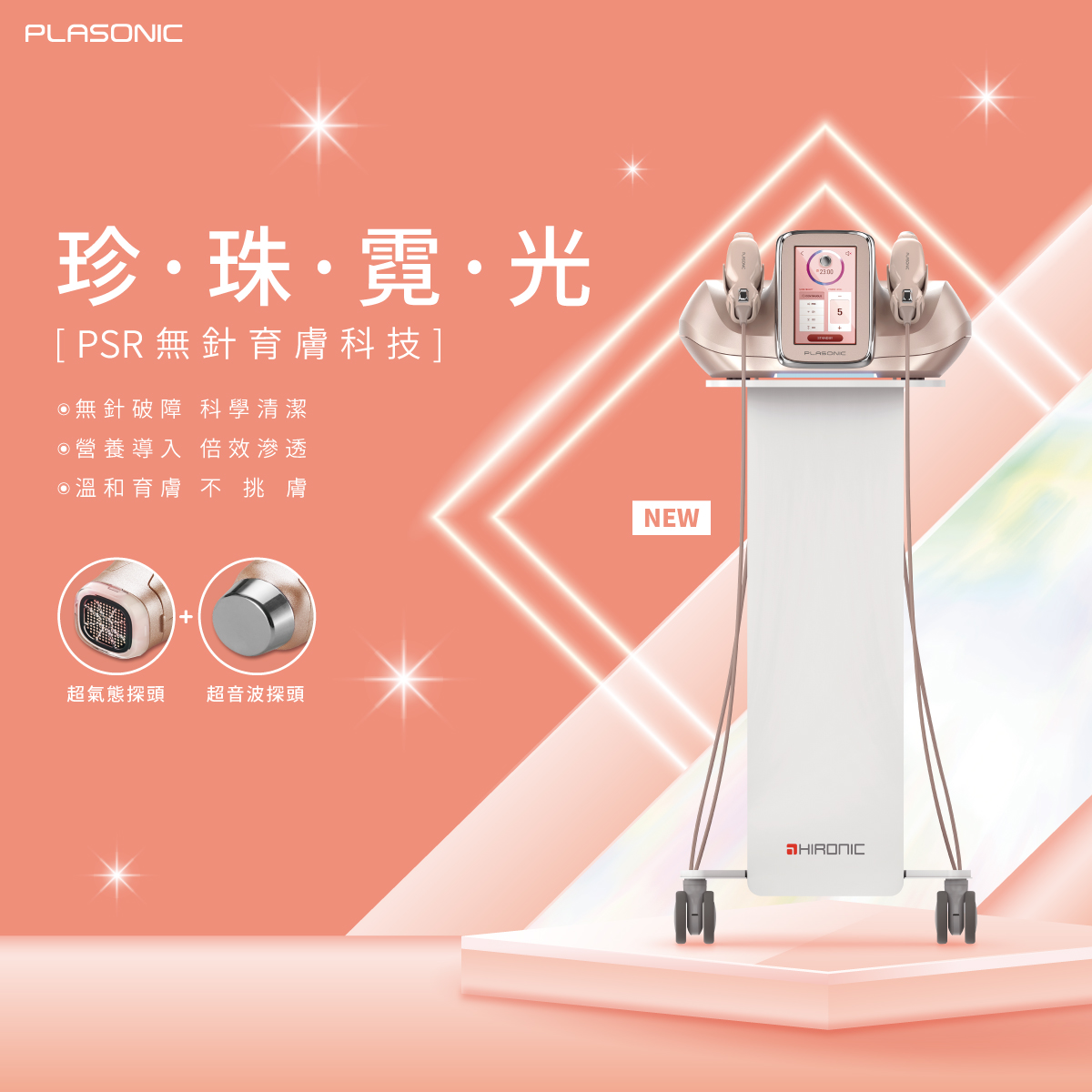 - 超氣態電漿:將大氣電離成超細氣態離子,進入毛孔深層,清除汙垢、油脂及老廢角質,讓肌膚通透輕盈。